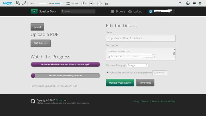 Para usar esta plataforma, necesitas crear una cuenta gratuita. Una vez que hayas creado una cuenta, puede comenzar a cargar sus presentaciones. Como se mencionó anteriormente, su presentación debe estar en formato PDF. Debido a que Speaker Deck solo admite archivos PDF, su presentación no reproducirá ningún video, archivo de audio o animación.