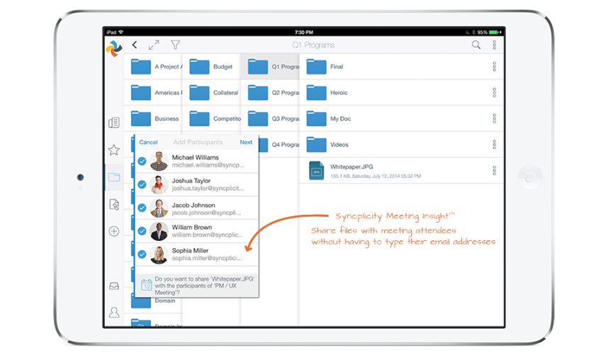 Con Syncplicity comparta de forma segura video, diseño y otros archivos pesados independientemente del tamaño, envíe archivos sin iniciar sesión en sitios FTP o portales. Además, ofrece una copia de seguridad automática de documentos de trabajo en tiempo real que permite recuperar versiones previas del archivo al momento. También cuenta con un editor incorporado para editar archivos de MS Office y anotar archivos PDF.
