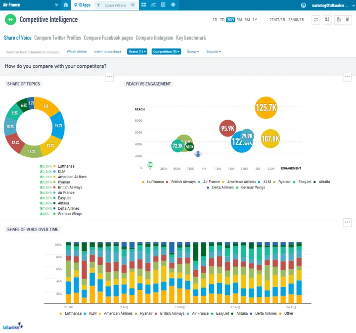 Talkwalker es una plataforma analítica de redes sociales increíblemente poderosa y fácil de usar. Proporciona información detallada sobre cualquier término de búsqueda y métricas sofisticadas sobre el rendimiento de los medios propios y obtenidos. Talkwalker ofrece cuadros de mandos, API e informes potentes y altamente flexibles que ofrecen filtros integrales e información útil sobre las redes sociales que crean un gran valor añadido para las marcas y agencias de todo el mundo.