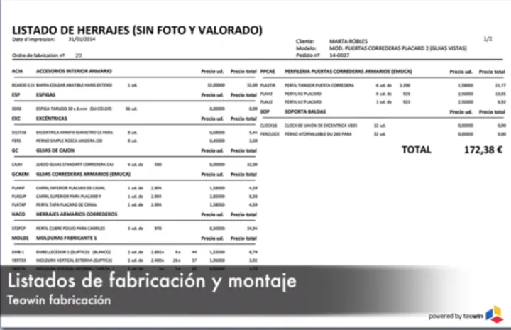 Tras la introducción de los pedidos, Teowin Fabricación calcula automáticamente el aprovisionamiento de material y todos los trabajos que deben realizarse para producirlo. Además genera todos los informes necesarios para coordinar el trabajo de los operarios (corte, canteado, mecanizado, montaje, etc.) ..