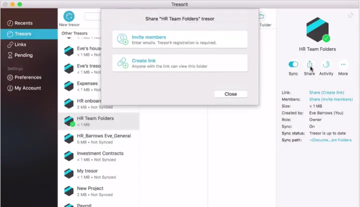 Aumente su seguridad sin perder productividad. Use Tresorit para mantener sus archivos seguros con un cifrado de extremo a extremo integrado. Suba sus archivos a tresors, sus carpetas irrompibles en la nube. No necesita cambiar la estructura de carpetas que ya tiene en su computadora.
