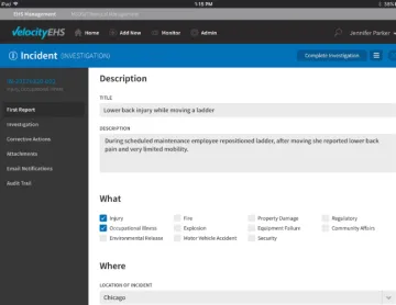 En cuanto a los módulos de VelocityEHS, se encuentran gestión de incidentes, auditoría e inspección, gestión de cambios, gestión de productos químicos, gestión de cumplimiento, gestión de capacitación, ergonomía, emisiones al aire, cumplimiento de residuos, calidad del agua, capacitación bajo demanda, métricas de rendimiento, análisis de riesgos, acciones correctivas y paneles configurables e informes. Esta gran software a su vez brinda funcionalidad móvil.