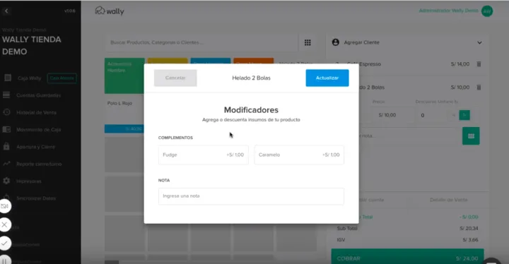Productos y Categorías Agiliza el proceso de venta configurando tus productos o categorías favoritas en la pantalla principal Wally. Todos los productos que pertenecen a una determinada categoría se mostrarán de un mismo color para encontrarlos fácilmente. Puedes incluir modificadores o complementos a tu pedido.