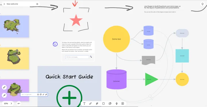 Weje es una plataforma de pizarra en línea que le ayuda a reunir contenido de múltiples fuentes en una sola pantalla, proporcionando contexto a un tema o proceso de negocio. Weje le ofrece un lienzo en blanco con zoom y un conjunto de herramientas que lo llenan, y hace que sea muy fácil colaborar, desarrollar, compartir y presentar su trabajo. Puedes hacer lluvia de ideas y construir mapas mentales, administrar proyectos y actividades definiendo tareas y manteniéndolas en tableros Kanban, discutir ideas en vivo e iterar en sprints como un equipo.