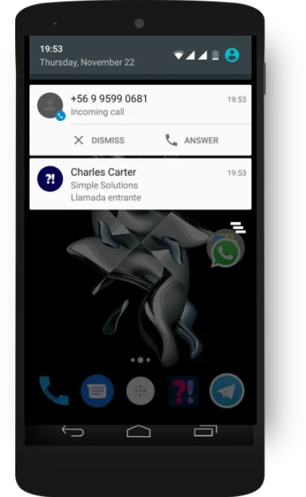 - Llamada Entrante Aunque no hayas guardado el número de alguno desde el celular, pero si en tu laptop lo/la agregaste a través del servidor de la compañía, Whatelse integrará esta información en todos tus dispositivos.