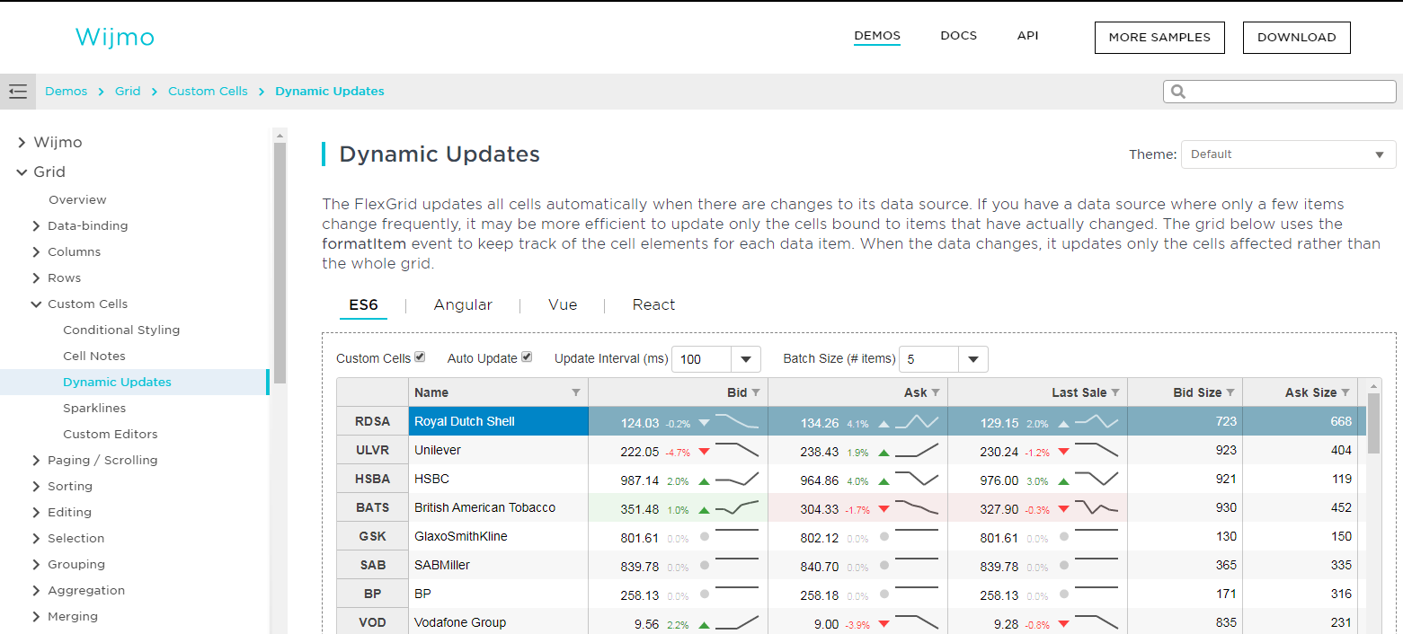 - Soporte de marco de primera claseDiseñado para ser independiente del marco, Wijmo incluye soporte completo para Angular , AngularJS , ReactJS , Vue.js y Knockout, con los mismos controles en los marcos.