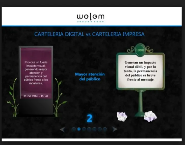 Wolom crea experiencias fidelizadoras Con ésta solución de cartelería digital se pueden transmitir ideas, conceptos o promociones, de una forma simple y ágil, cuyo eje principal radica en el desarrollo de contenidos de gran impacto visual.
