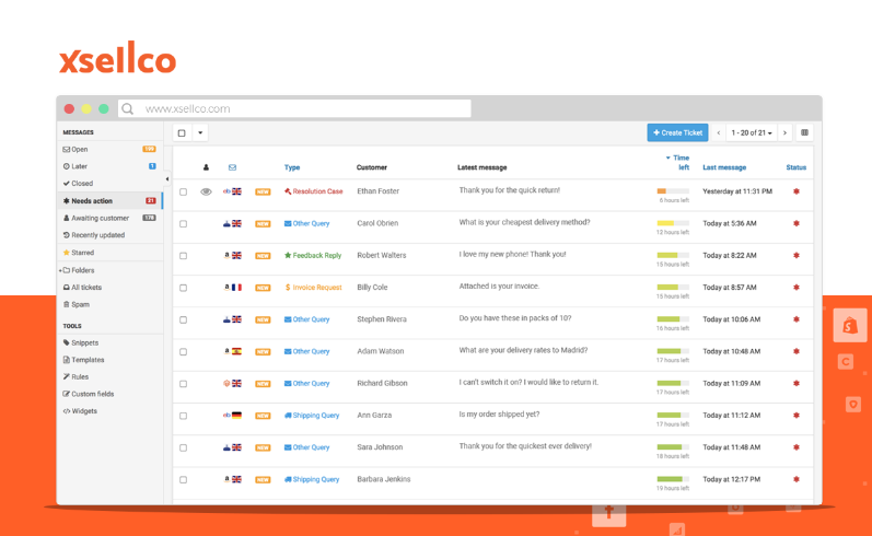 xSellco Helpdesk es el único servicio de ayuda . Centralice todas las consultas de los clientes y los detalles de los pedidos de cada canal de ventas en un tablero conectado. xSellco prioriza su bandeja de entrada en función de la urgencia de los mensajes, así como los subprocesos de todas sus ventas, envíos e información de pedidos, por lo que nunca debe buscar datos de clientes. Las respuestas sugeridas y la traducción automática del idioma reducirán los tiempos de respuesta, lo que significa que habrá más clientes satisfechos.