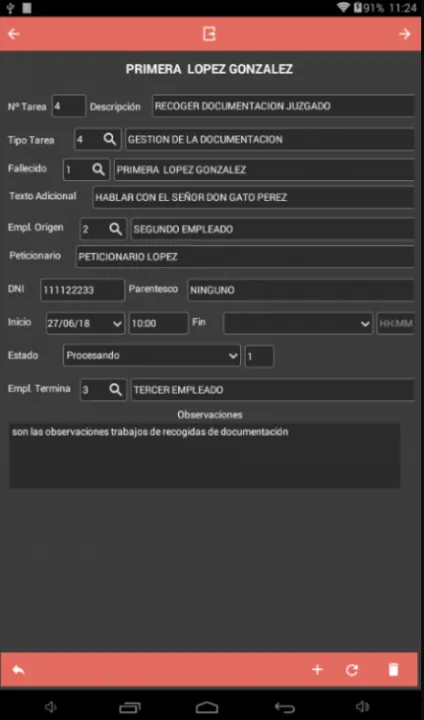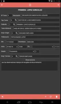 Datos como las facturas, expedientes, esquelas, recordatorios, partes de juzgado, partes de defunción, sepultura, traslados, empleados, etc… Otra característica está en el control de las tareas y empleados, donde todos los servicios y tareas ejecutadas se identifican los empleados que las comienzan y los que se encargan de finalizarla.