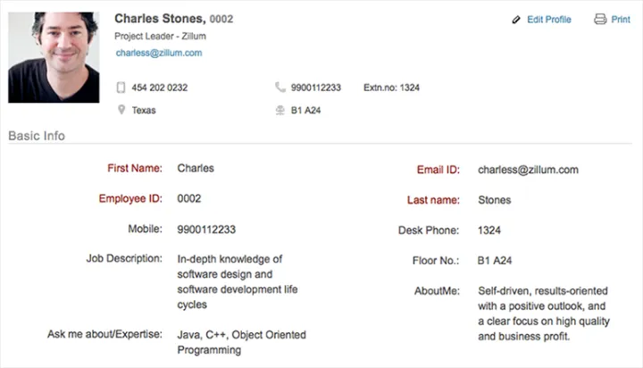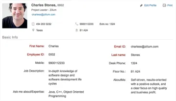 Ahorre tiempo con características de autoservicio.Zoho People permite a los empleados actualizar sus datos personales, conjuntos de habilidades, horas de inicio y término. Los gerentes pueden acceder a toda la información sobre los subordinados, tener el control sobre las autorizaciones, la programación del tiempo libre y mucho más.