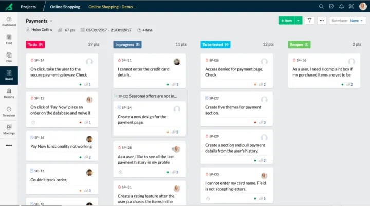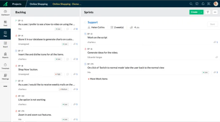 Zoho Sprints es una herramienta en línea gratuita para la planificación y el seguimiento ágiles. Le permite crear historias de usuarios, agregar puntos de estimación, programar reuniones ágiles y usar hojas de horas para hacer un seguimiento de las horas de trabajo.